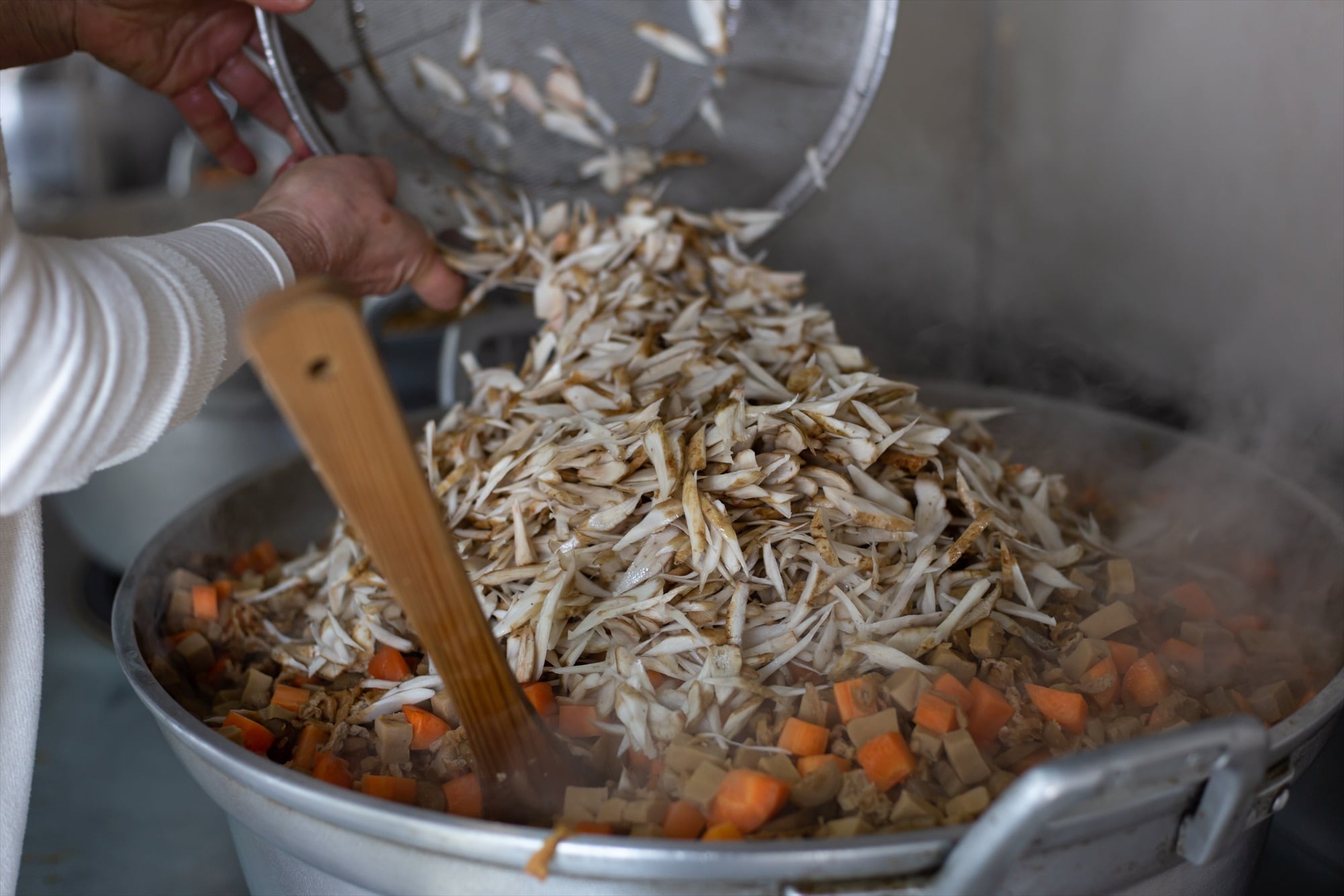 鶏肉(兵庫県産、播州百日どり)、ごぼう、人参、醤油、油揚げ、高野豆腐、こんにゃく、砂糖、清酒、だし(いりこ、昆布)/豆腐用凝固剤、重曹、水酸化カルシウム、(原材料の一部に小麦・大豆を含む)